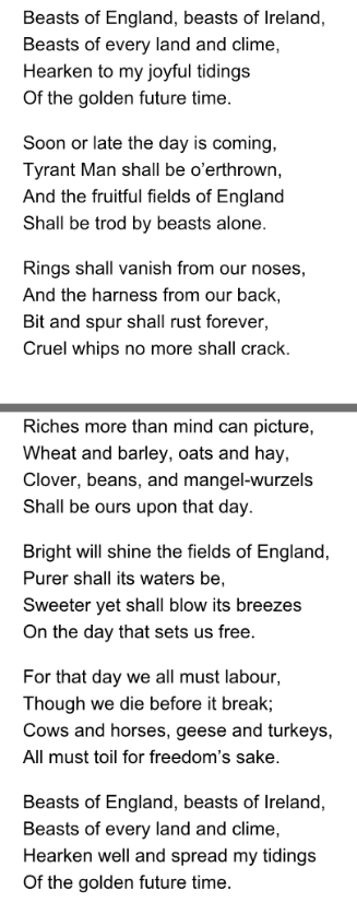 Is it not crystal clear, comrads, that all the evils of this life of ours spring from the tyranny of human beings? Only get rid of Man, and the produce of our labour would be our own.