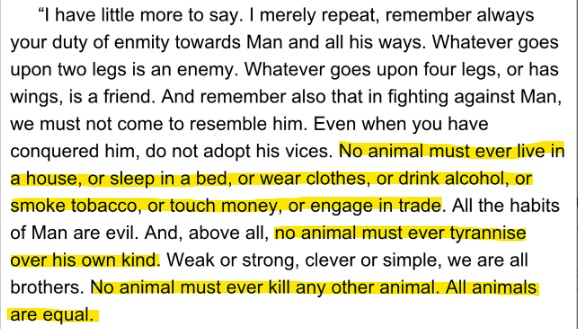 …no animal must ever tyrannise over his own kind. All animals are equal.