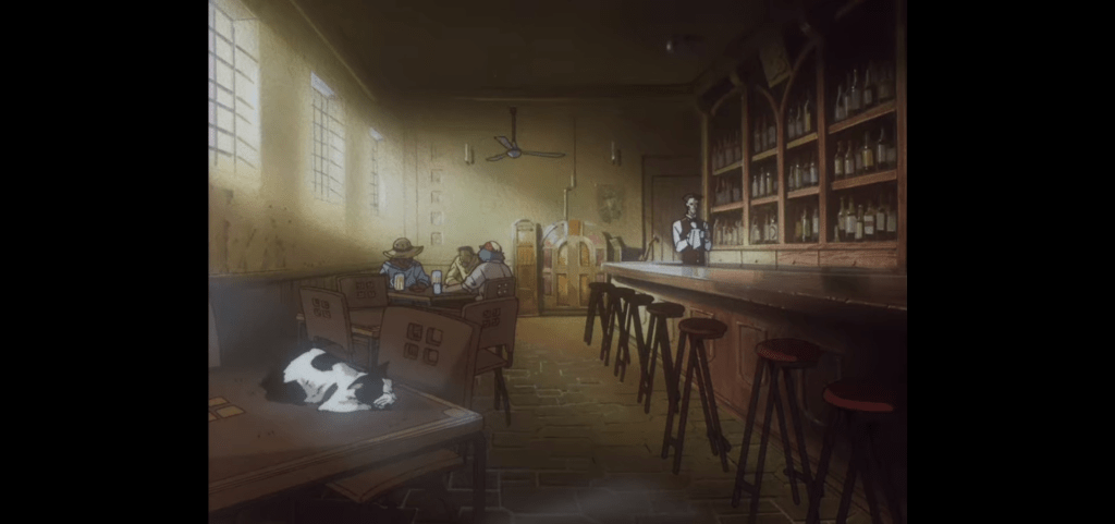 This feels like something out of a Tarantino movie, not the anime. The place is bigger. The colors are washed out. There is only one other person in the joint, making it desolate and empty, devoid of any atmosphere.