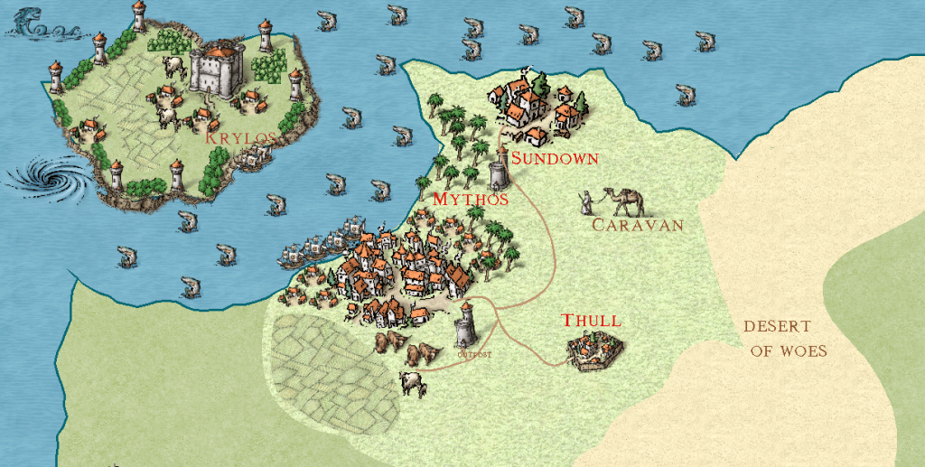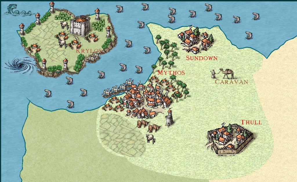 The major port town in this region is home to merchants, inns, taverns, and traders. It is also not uncommon for pirates to be seen in the town for shore leave and restocking. As long as you do not cause trouble in the town, Mythos will not bar you from conducting business.
