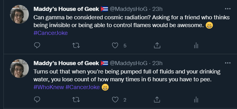 I did start out being scared of how this would go. The words “Chemo” and “Radiation” are scary, to say the least, but then I thought about it, and decided to combat it by making comical entries in a cancer diary on Twitter.