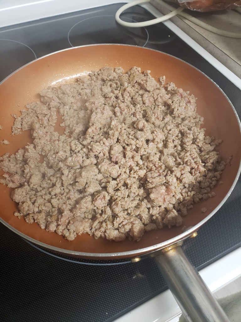 - On medium heat, cook the sausage until it’s almost done. Leave some pink.