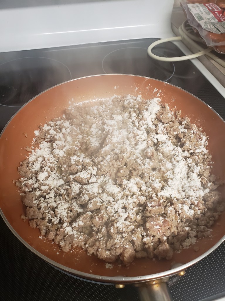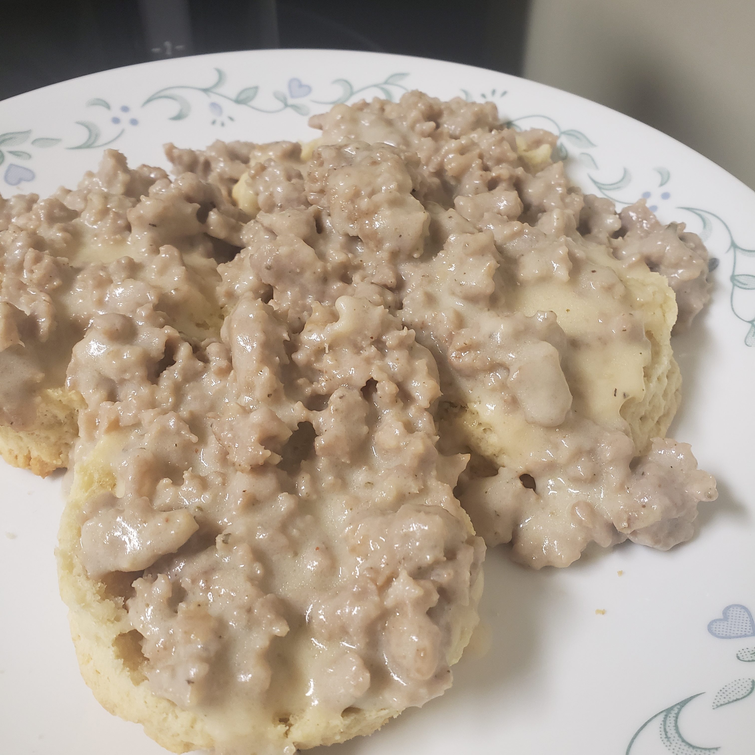 Now, it’s time for a more traditional southern breakfast: Sausage Gravy and biscuits. It’s filling and you can add other things on the plate if you think you have the room.