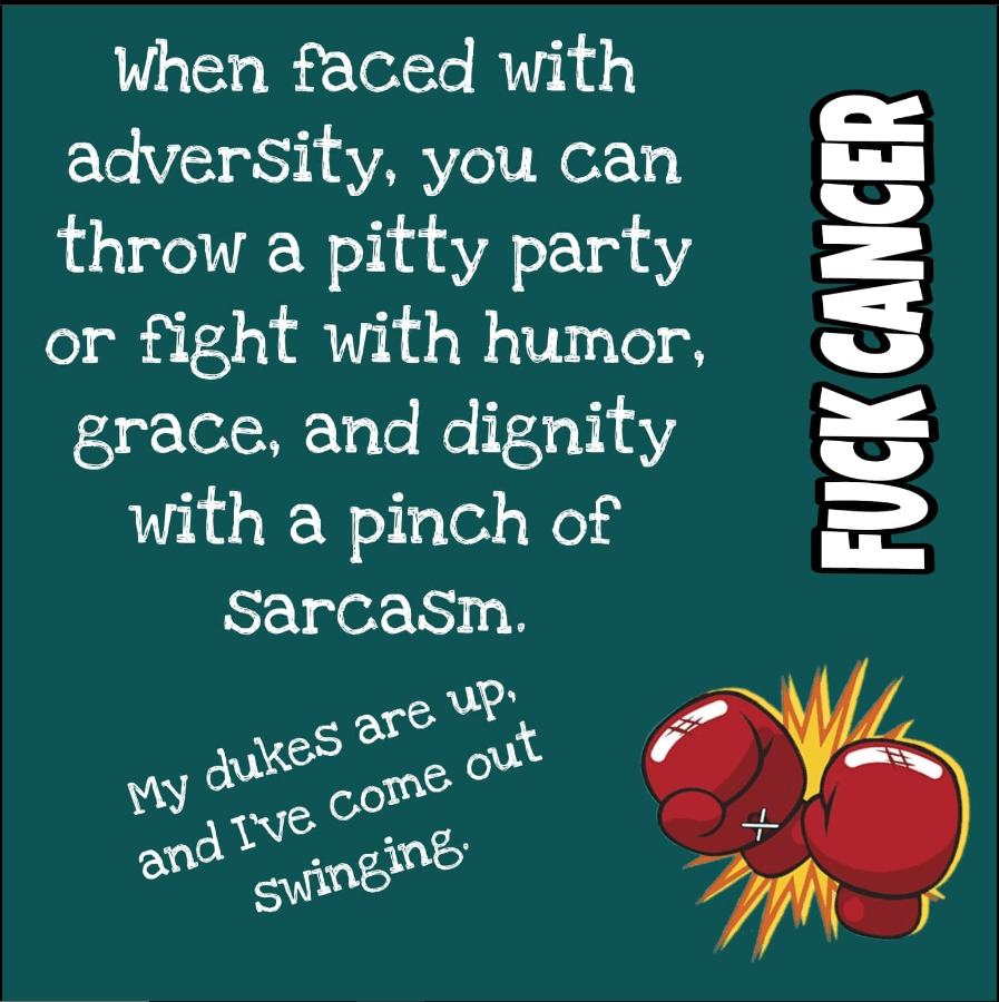 I am a firm believer in attacking my situation with as much humor as I can muster, and I am not going to stop anytime soon. Humor and snark are the best weapons I have to fight this along with listening to my team and following instructions.